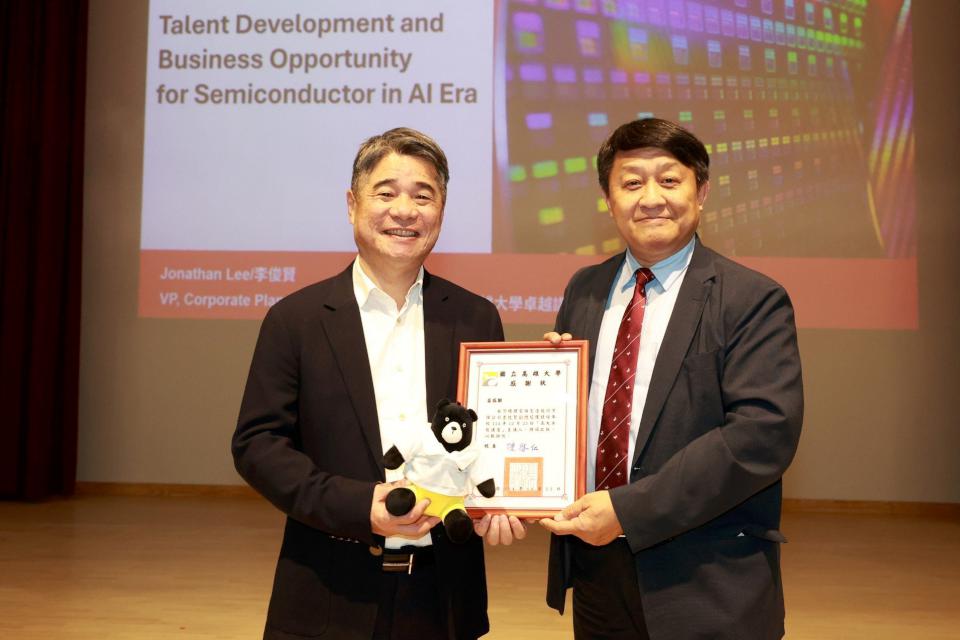 國立高雄大學卓越講座12月23日邀請台積電副總李俊賢(圖一)暢談「AI 浪潮下半導體產業的機會與挑戰及人才培養」,深入剖析人工智慧科技產業趨勢、台灣半導體關鍵角色,未來人才需用核心能力,高大校長陳啓仁(圖二右)代表頒贈感謝狀時說,全球科技快速演進,產業人才需求劇變,高等教育須秉持前瞻視野,培養學生跨域能力,李俊賢理工與管理經驗豐富,並深入觀察半導體趨勢、企業競爭力與人才發展,期盼專講有助學生掌握人工智慧與半導體關鍵變化,布局鏈結南部產業,拓展國際視野,強化未來就業競爭力。