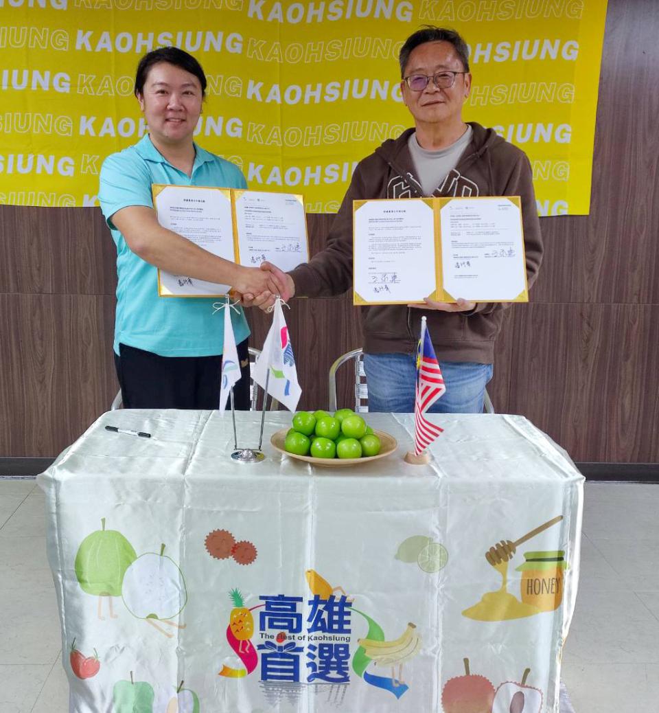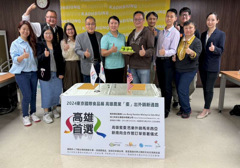 高市農業局參與2024日本東京食品展主打高雄物產館,創下訂單2億6000萬元,高市匯通果菜生產合作社經理潘阡華(圖一左)3月20日與馬來西亞農業資材商Lou Bang Rambo 負責人王永建(圖一右)簽約合作,於農業局長張清榮、保鮮專家恰口科研公司、財團法人農業科技研究院、清華大學創業車庫、國家科學及技術委員會新竹科學園區管理局、出口商雫貿易代表等人見證,Lou Bang Rambo第一年採購逾10公噸高市燕巢蜜棗及珍珠芭樂,上架當地市場通路。