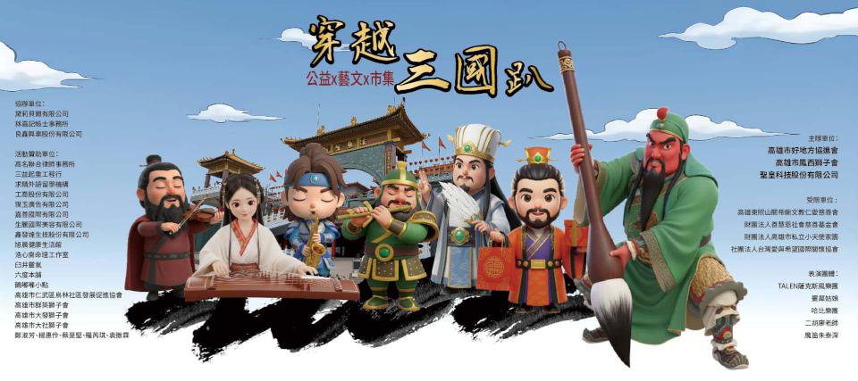 高市好地方協進會攜手高市鳳西獅子會、聖皇科技合辦兼具公益、藝文、市集《穿越三國趴踢》,1 月 11 日上午11點至下午3點在高市大樹區東照山關帝廟舉行,鼓勵大小朋友換上古裝參與同樂,創意尋寶市集所得全數捐做公益,並力邀天能薩克斯風樂團、哈比重奏樂團、靈犀姑娘與魔笛朱泰深等登台獻藝,還商請5名命理大師諮詢服務,書法名家現場揮毫贈手扇,中午備有免費自助餐和各界結緣,鳳西獅子會會長李建昌、聖皇科技董事長張育彰、物理治療所院長朱恩緯異口同聲地表示,活動兼具趣味、活力,顛覆公益想像。活動設計總監鄭國章說,和親友一起參與公益,療癒身心。圖/好地方協進會提供、文/高培德