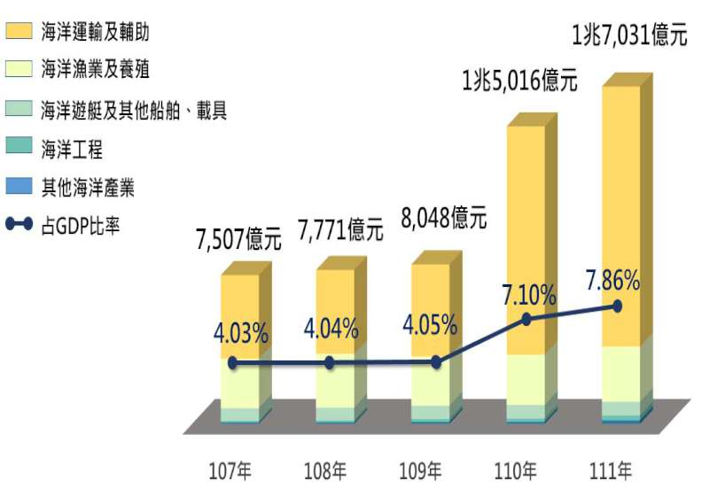 海委會111年著手建立產值統計方法,並蒐集相關資訊,預估海洋產業產值,配合海洋產業發展條例施行,公告海洋產值107年7507億元成長至111年1兆7031億元,占國民生產毛額也從4.03%增為7.86%,另111年海洋運輸及輔助產值1兆3126億元、海洋漁業與養殖2795億元、海洋遊艇及其他船舶載具688億元分居前三名。圖/海委會提供、文/高培德