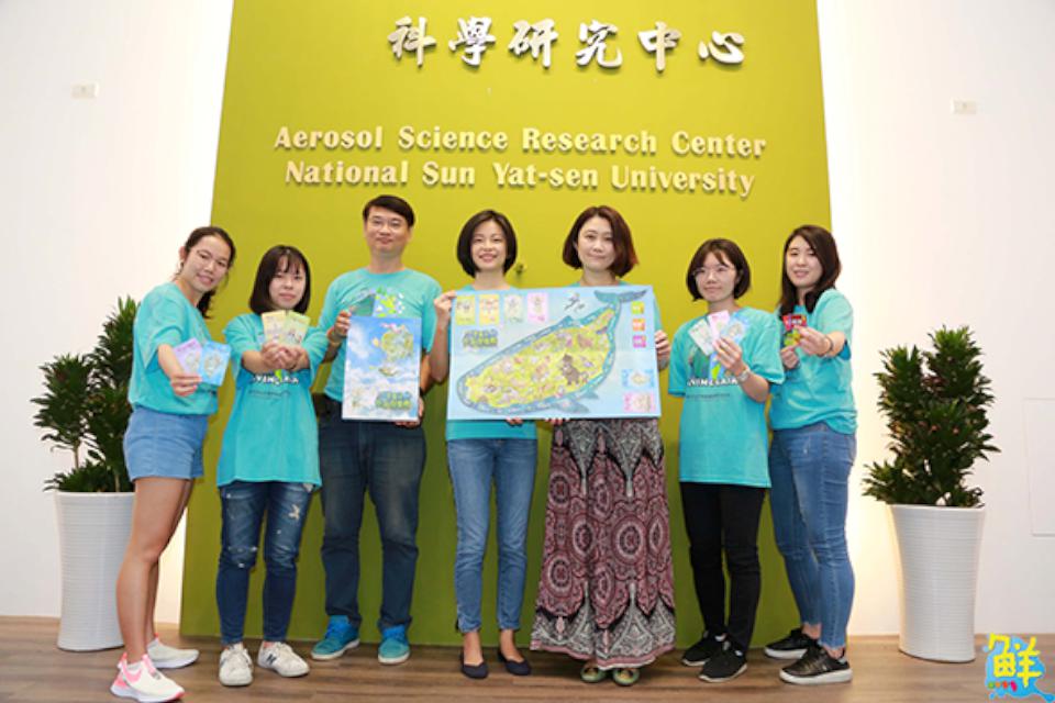 氣膠科研中心主任、化學系副教授王家蓁(圖右三)表示,因應全球各地空品治理情況,設計專屬當地桌遊,主視覺熱氣球圖案代表全球人口同在一條船上,應攜手找出環境永續策略,主地圖取材鯨魚模擬台灣地形,並繪製多種特有生物,強化玩家關懷生態環境觀念,凸顯海天同體概念。