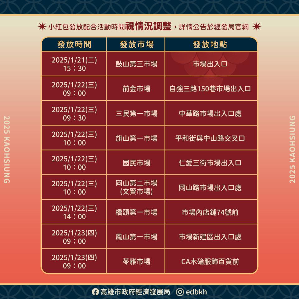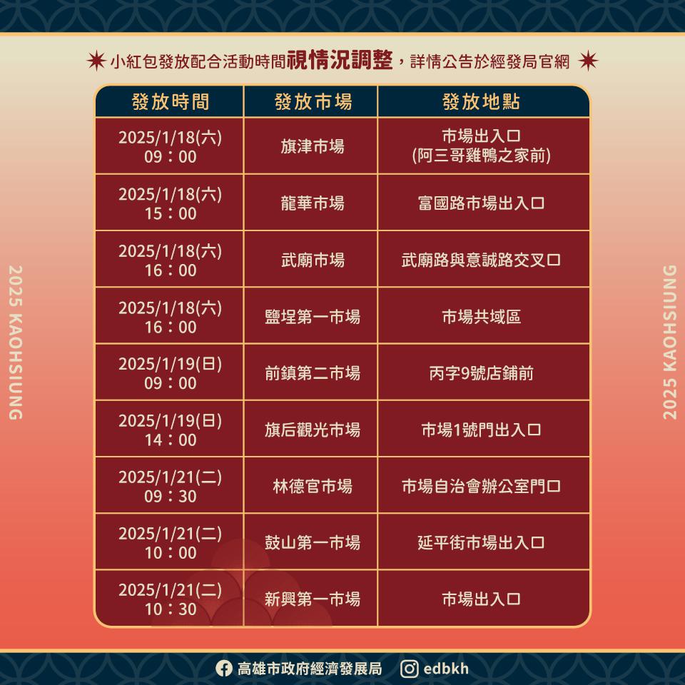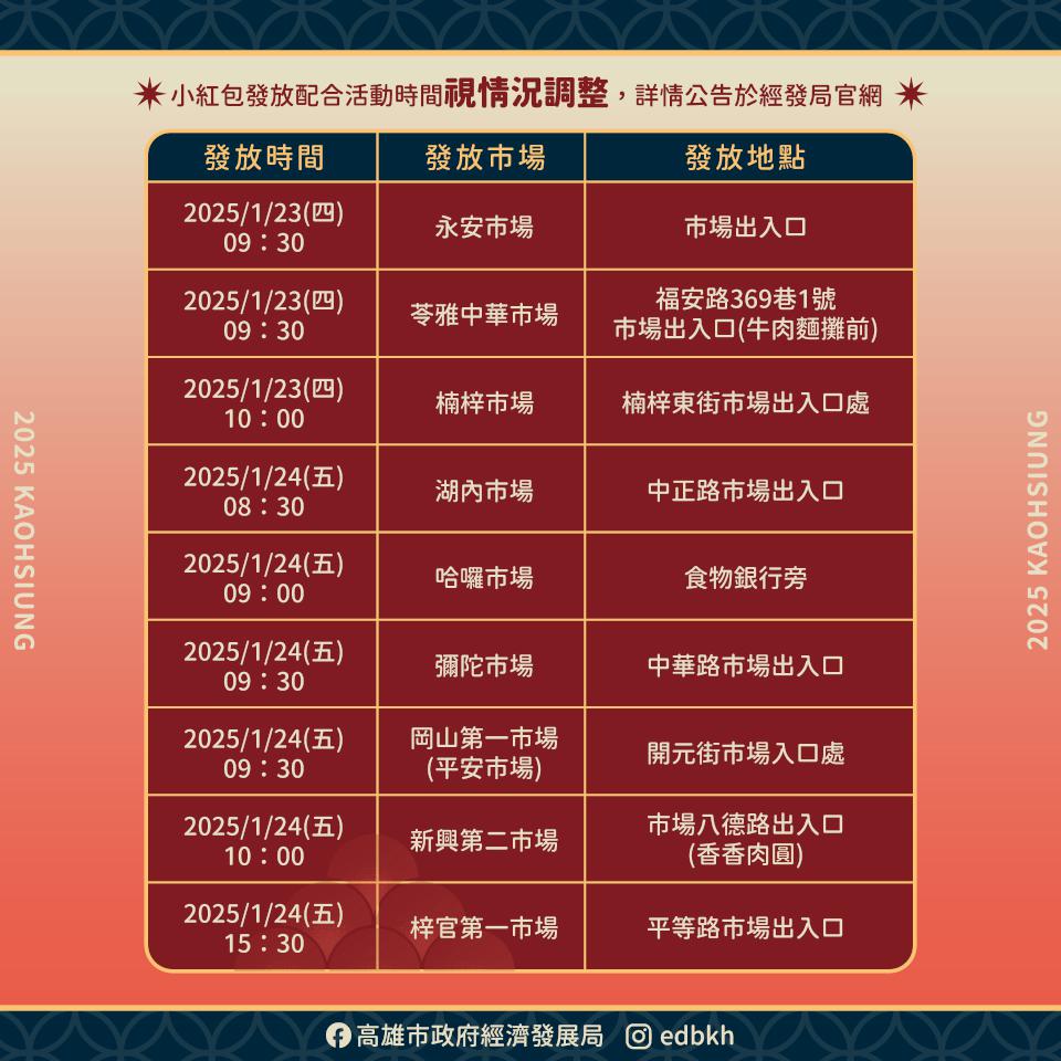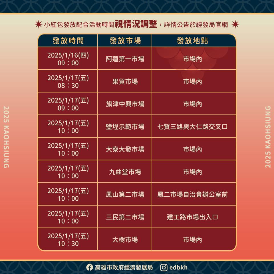 高市經發局推薦傳統市場年貨伴手禮及除夕團圓飯需用食材,並連續2年結合36處公有市場發放蛇年開運小紅包,數量有限,送完為止,高雄傳統市場販售商品種類豐富多元,從新鮮蔬果到各式生鮮食材一應俱全,以其優質和新鮮度,成為民眾過年採購的首選地點。高雄市政府經濟發展局在農曆年前,特別推薦市場內的年貨伴手禮及年夜飯所需的新鮮食材,市府也連續2年與市場合作,提供全市36處公有市場發放「蛇年開運小紅包」,數量有限、送完為止。