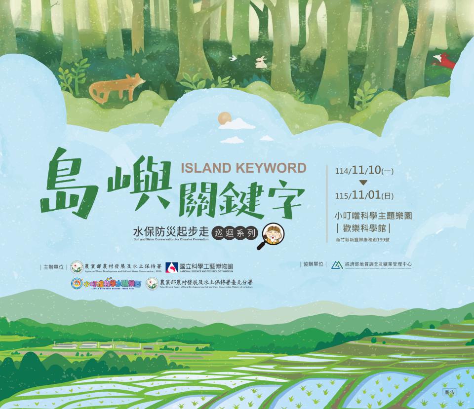 農業部農村發展及水土保持署、高雄科工館、農業部農村發展及水土保持署臺北分署主辦、經濟部地質調查及礦業管理中心協辦「島嶼關鍵字—水保防災起步走」巡迴特展114年11月10日至 115年11月1日在新竹縣小叮噹科學主題樂園歡樂科學館舉行,展覽取材農村水保署繪本《小魚的祕密假期》與《爺爺的魔法書》設計10組互動展示單元,透過故事、遊戲與實作體驗,轉化抽象防災概念及環保知識變身趣味學習內容,同步展出雨量筒、水位計、衛星定位儀等水保監測系統文物與科技設備,另規劃教具與繪本體驗活動,寓教於樂灌輸大小朋友水保、減防災與環保等正確概念,串連園區環教活動,發揮加乘效果。圖/科工館提供、文/高培德