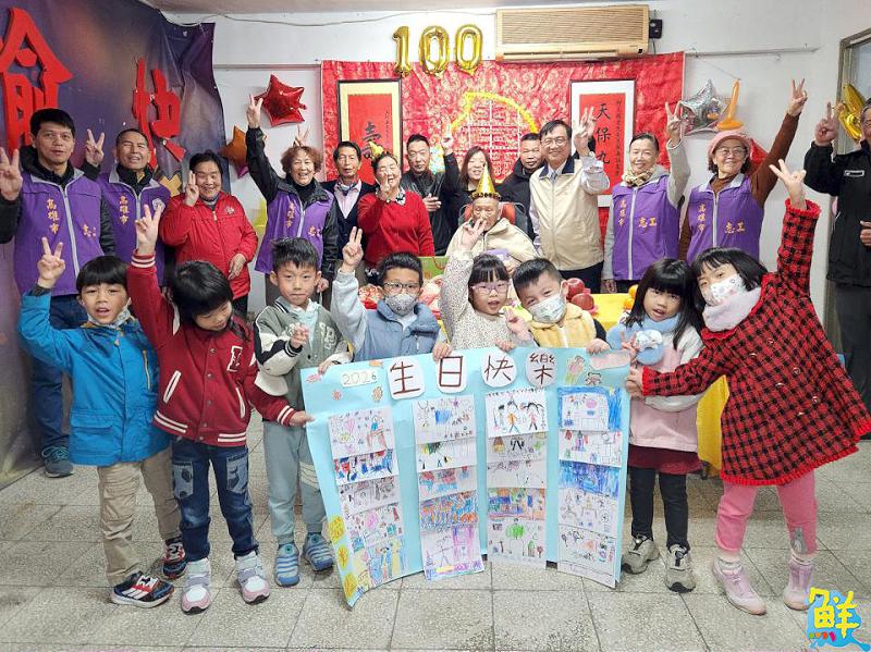 日前高雄市榮民服務處處長劉雅魁邀集里長、榮欣志工及海育幼兒園小朋友等,為高齡百歲的榮民柳爺爺祝壽,現場氣氛溫暖感人。