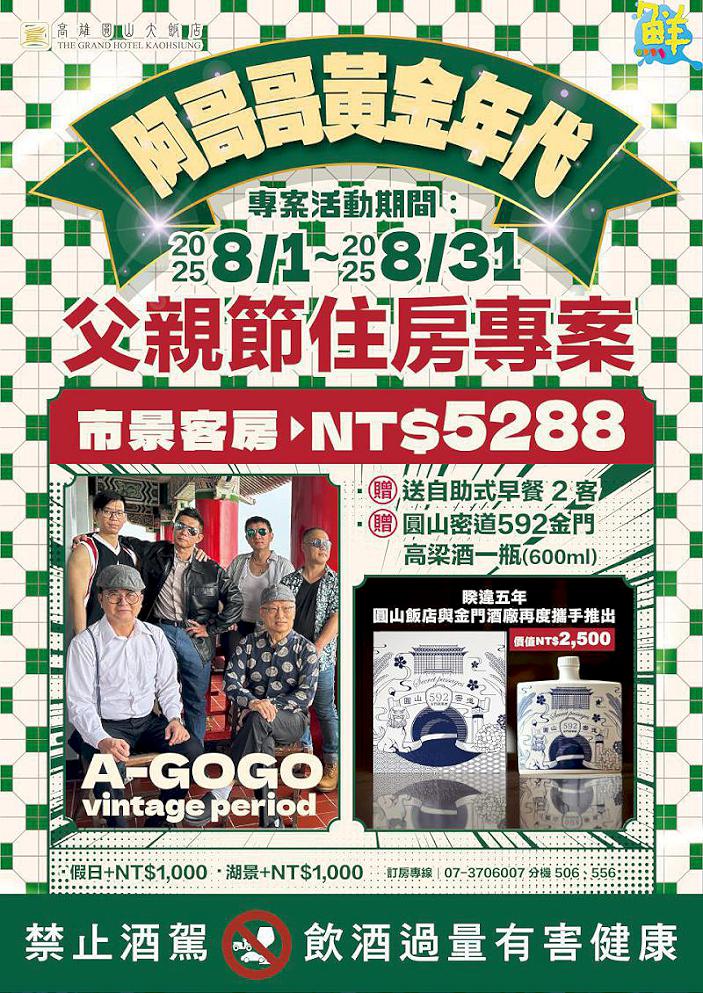▲父親節就帶爸爸回到他的青春年代!高雄圓山大飯店推出「阿哥哥的黃金年代」餐飲與住房活動,重溫經典時光。(圖高雄圓山大飯店提供)