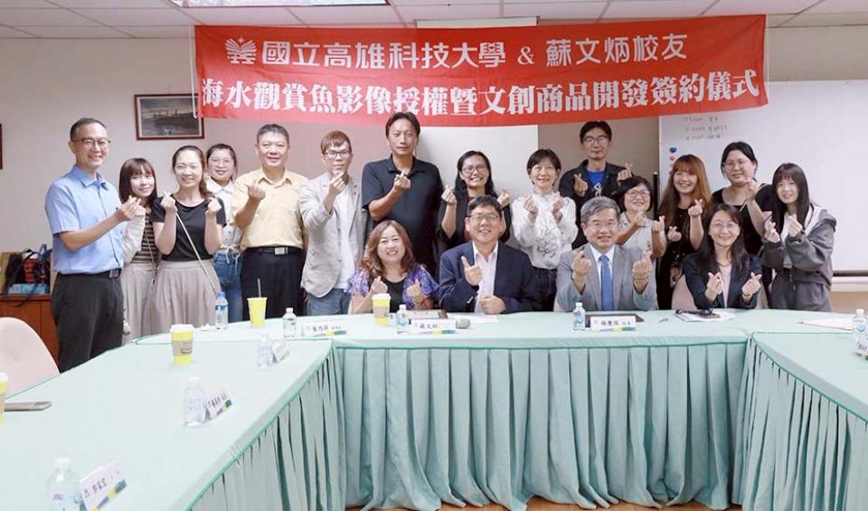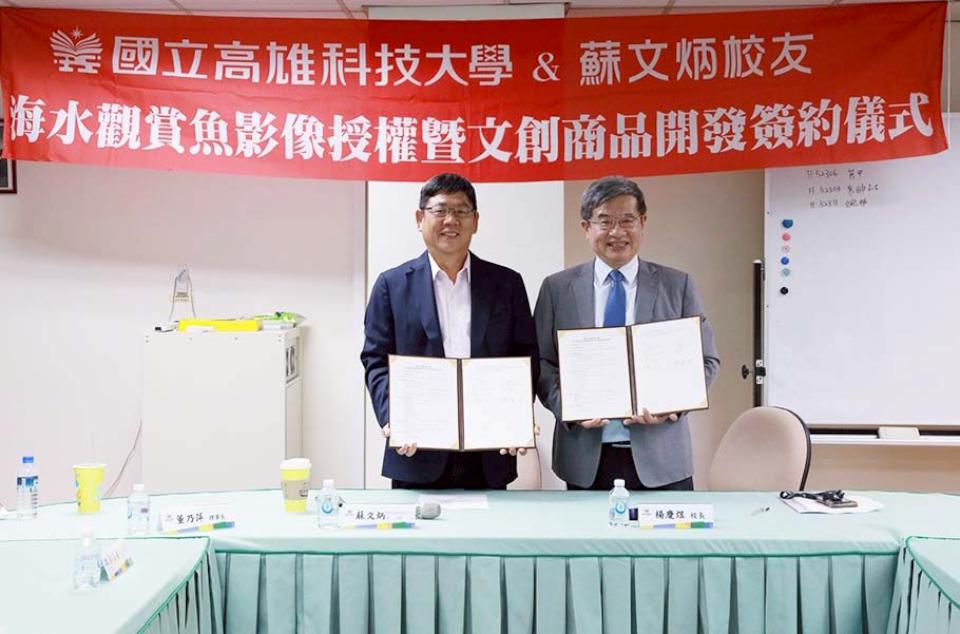 前高雄海專校友蘇文炳(圖一左)10月15日與國立高雄科技大學校長楊慶煜(圖一右)簽署合作備忘錄(MOU),同意授權海洋生物技術系養殖觀賞魚影像10年,提供母校研究及開發使用,收益獎助優秀弱勢學弟妹。