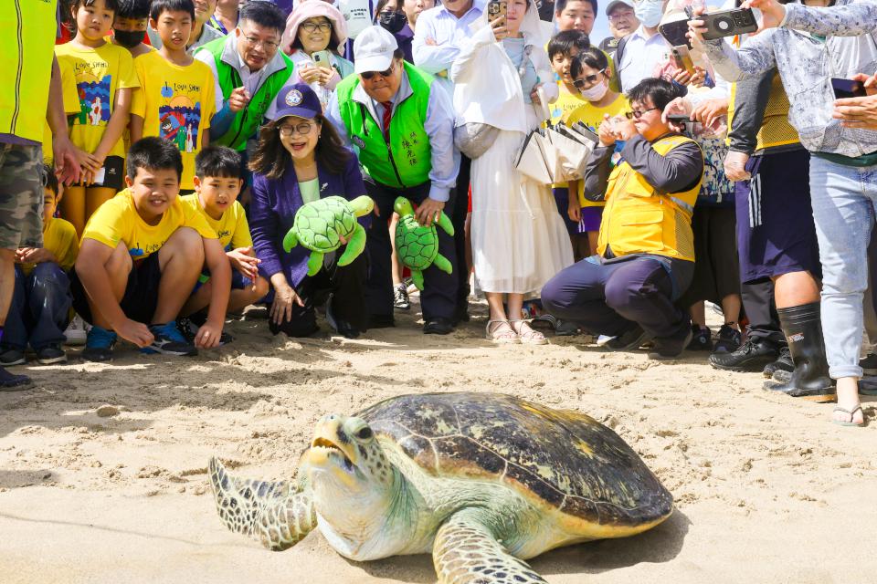 6月16日世界海龜日,澎湖縣政府6月16日在馬公市嵵裡沙灘野放10隻曾因受傷擱淺及健康不佳海龜,澎湖縣長陳光復、海洋委員會主委管碧玲、海洋保育署署長陸曉筠、交通部觀光署澎湖國家風景區管理處副處長呂玉鉛、嵵裡國小校長翁安明、澎南國中校長鄭維傑、澎湖縣議員許國政、嵵裡國小、澎南國中百名師生等人見證,管碧玲說,感謝各界致力救援擱淺海龜,其中民國111年透過大義宮協助野放海龜113年續擱淺興仁水庫,經海洋保育類動物救援組織網(MARN)團隊費時一年照護重回大海。圖/海保署提供、文/高培德