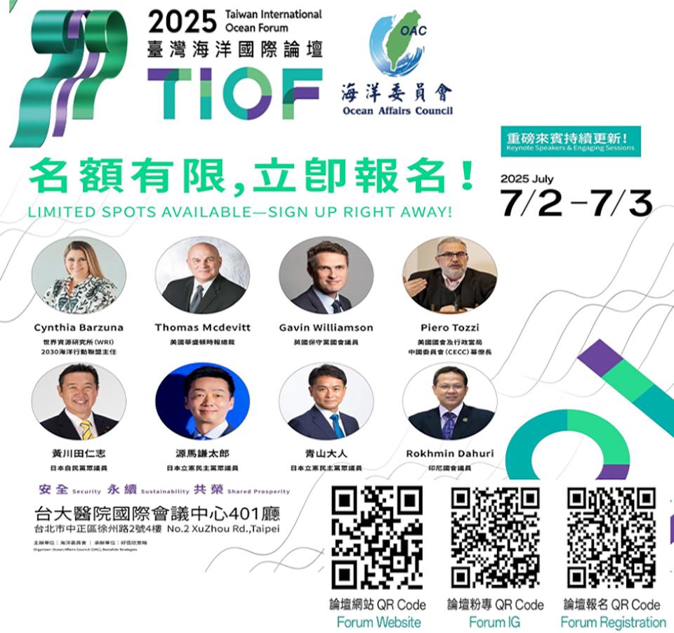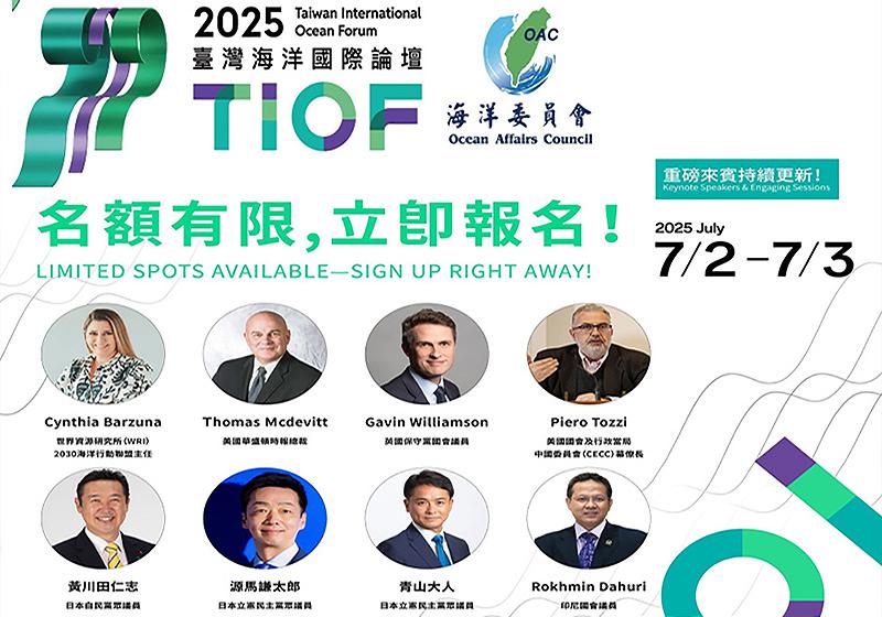 海洋委員會2025臺灣國際海洋論壇(2025 TIOF)7月2日至3日在台大醫院舉行,秉持海域安全、藍色經濟等核心精神,聚焦區域灰色地帶行動、海底電纜遭破壞、印太海洋意識(IPMAD)建構、永續海洋產業、ESG推展藍色經濟角色、女性賦權、藍色金融等議題,邀請美國、英國、法國、比利時、以色列、澳洲、日本、韓國、印度、印尼、菲律賓、越南、馬來西亞等國重量級講者參與專題演講、高層對話、專家分享、青年對話等議程,即日起至6月20日歡迎各界提案。