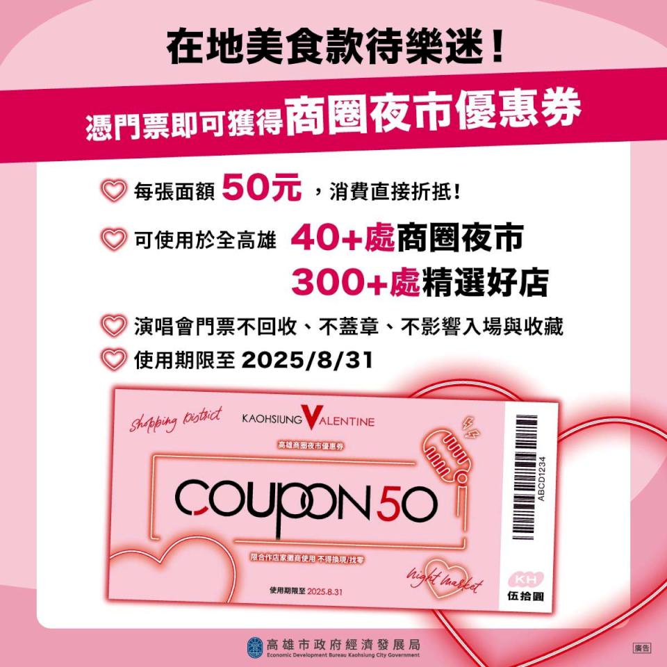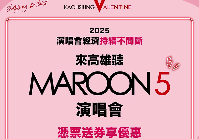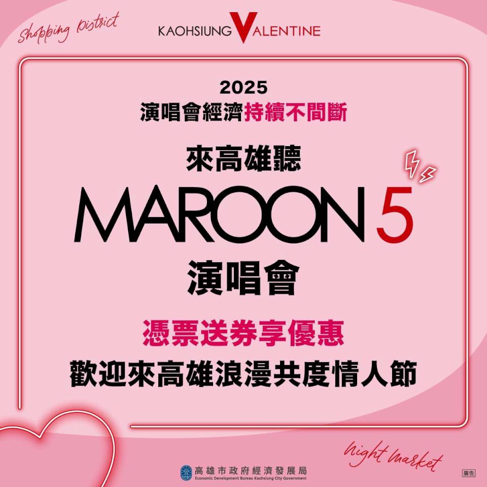 葛萊美獎搖滾天團魔力紅(Maroon 5)Asia 2025 Kaohsiung2月14日高雄世運主場館舉行,陪伴歌迷共度情人節浪漫夜,2月14、15日下午2點至晚上8點(巨蛋及美麗島站至晚上12點)憑演唱會門票前往高雄捷運左營、巨蛋、高雄車站、美麗島、三多商圈、鹽埕埔站可兌換50元商圈夜市優惠券一張,憑券前往超過40處商圈夜市及逾300處店家消費即贈蛋糕、茶飲或滿額享優惠等,其中精肉酒舖民享店滿2人用餐贈情人節限定巴斯克乳酪蛋糕一份,千層蛋糕新光、陽明及博愛店單品95折,咖啡品牌六合館及美術館店最佳放閃時刻活動,指定時段消費9折或95折,鹽埕區知名甜點店消費滿500元送常溫磅蛋糕一片,更多資訊可上商圈夜市優惠券官網及經發局官方社群查詢。圖/經發局提供、文/高培德