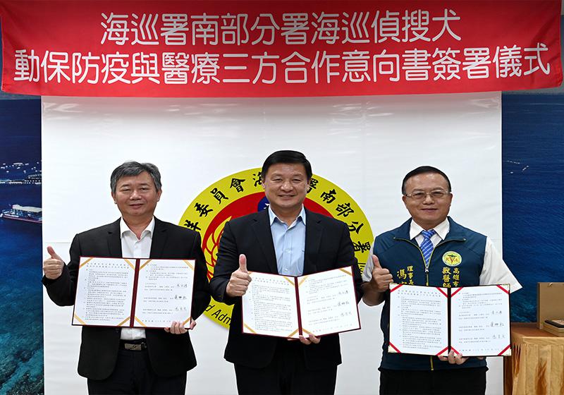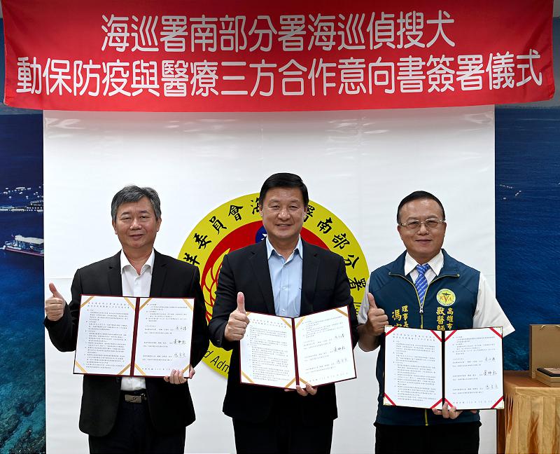 海巡署南部分署分署長宋子陽(圖一中)10月23日與高市農業局動物保護處處長葉坤松(圖一左)、高雄市獸醫師公會理事長馮宗宏(圖一右)簽署海巡偵搜犬動保防疫與醫療三方合作意向書,宣示攜手提供定期健檢、疫苗注射、寄生蟲防治、營養建議等醫療照護,維護偵蒐犬健康,強化執勤量能。圖/海巡署南部分署提供、文/高培德