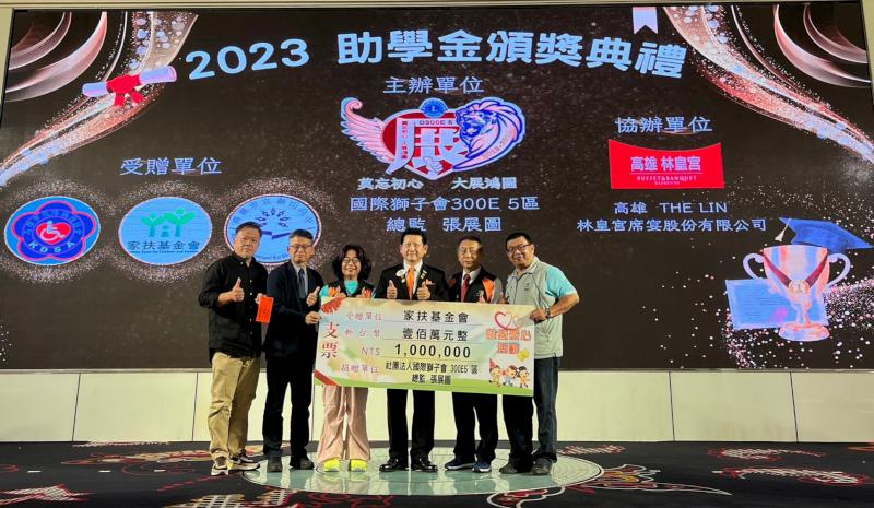 社團法人國際獅子會300E 5區12月8日舉行2023年佰萬助學金頒獎典禮,南、北高雄家扶中心、社團法人高雄市殘障服務協會及高市鼓山高中舉重隊等220名學生接受表揚,高市社會局科長鍾翠芬、國際獅子會300E 5區總監張展圖、南高雄家扶中心扶幼副主委賴曼綺、主任郭淑美、北高雄家扶中心扶幼主委薛仲銘等人歡喜見證,賴曼綺說,感謝國際獅子會300E 5區每年捐資百萬助學,鼓勵獲獎學生持續精進,未來心有餘力樂意助人,形成良善循環。圖/南家扶中心提供、文/高培德