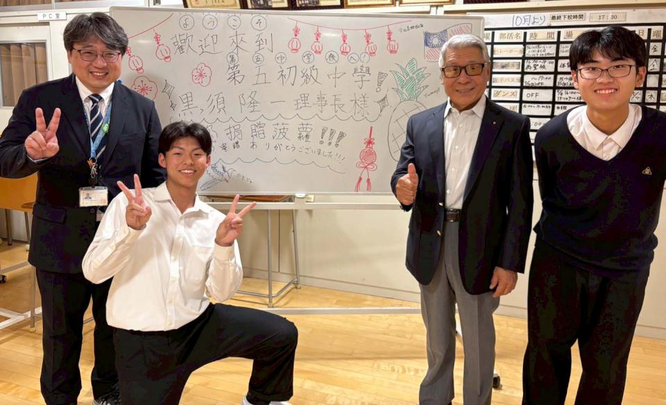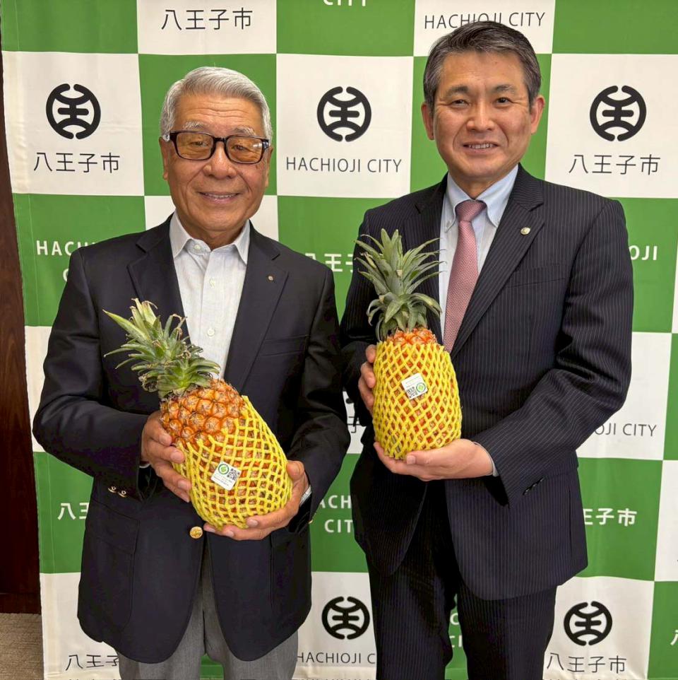 農業局媒合八王子台灣友好交流協會理事長黑須隆一採購高市鳳梨轉贈八王子市國中,黑須隆一與八王子市立第五中學師生互動,並拜會八王子市長初宿和夫,還入鏡感謝高雄市民。