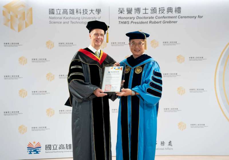 國立高雄科技大學12月2日歡慶6週年校慶,校長楊慶煜(圖一右)12月1日頒授姊妹校德國福茲堡施韋因富特科學技術大學(THWS)校長羅伯特‧甘比那(Robert Grebner)(圖一左)榮譽博士學位,誌慶該校升格同時深化兩校友好情誼,未來持續合推機器人學程、機電學程等兩大領域。