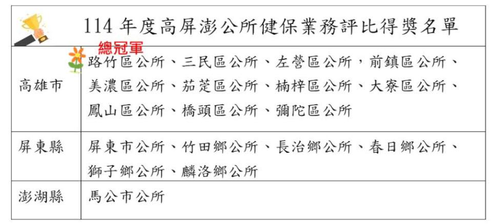 健保署高屏業務組串聯高雄、屏東與澎湖地區77家鄉鎮市區公所,透過評比活動,打造在地化與數位化便民服務。健保署高屏業務組11月7日表揚高市路竹、三民、左營,前鎮、美濃、茄萣、楠梓、大寮、鳳山、橋頭、彌陀區公所、屏東市公所、屏東縣竹田鄉、長治鄉、春日鄉、獅子鄉、麟洛鄉、澎湖縣馬公市公所等18家服務績優單位,其中高市路竹區公所勇奪總冠軍,締造11連霸紀錄,高市美濃區及屏東市公所便民服務與弱勢通報表現亮眼。高市美濃區民阿雅車禍失能,治療期間先生不幸辭世,無力負擔健保費,區公所人員協助通報,高屏業務組運用健保愛心專戶協助繳納欠費,並轉介慈善團體後續關懷,阿雅感謝健保署及公所及時伸援,高屏業務組組長林淑華說,健保署持續精進健保服務,區公所協助力推健保服務,貼近民眾需求,轄區77處公所服務近66萬人,運用數位服務通報失親兒少、身障、重大傷病及偏鄉獨居老者等、協助繳納積欠保費等累計 940件,嘉惠超過1600人。圖/健保署高屏業務組提供、文/高培德
