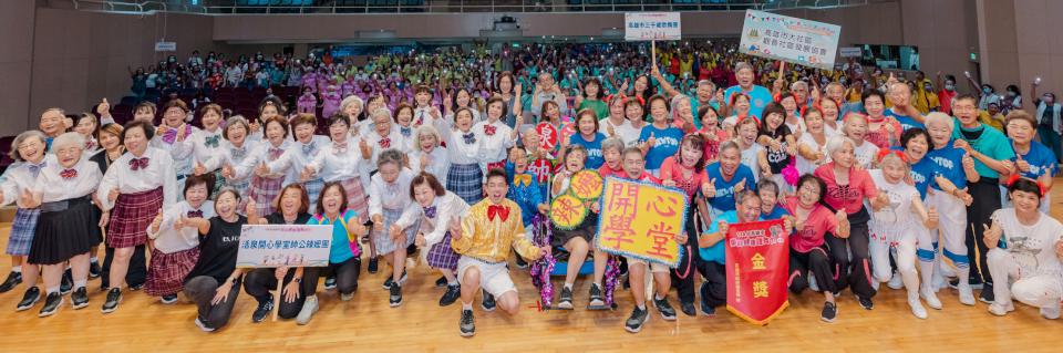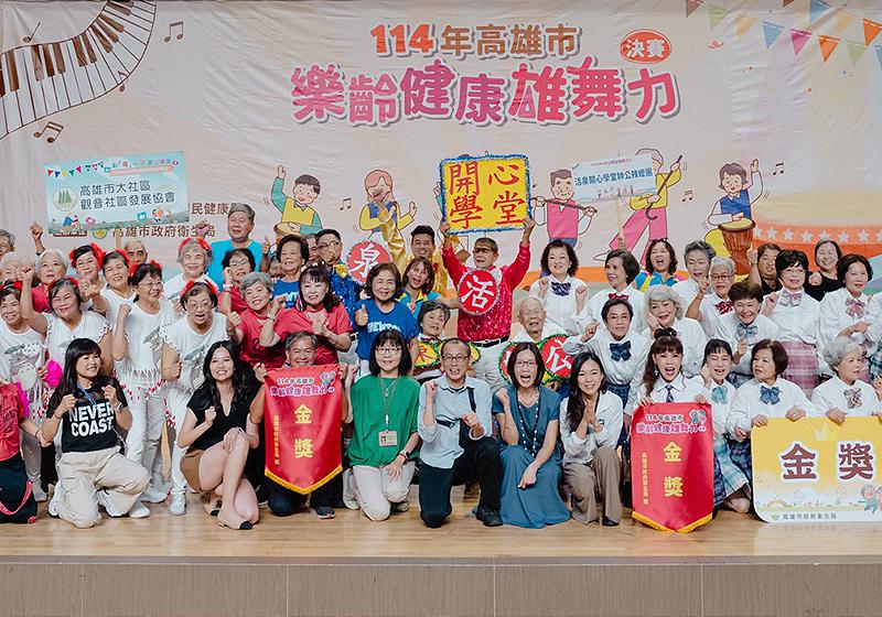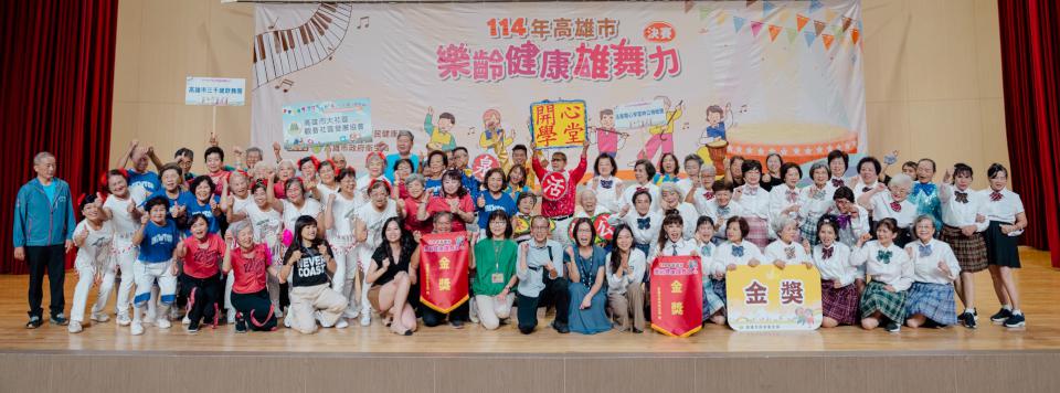 高市衛生局樂齡健康雄舞力競賽吸引58隊角逐,其中11隊勝出,6月19日決戰國立高雄師範大學和平校區,最終產生金獎活泉開心學堂帥公辣嬤團、高雄市三千歲歌舞團、銀獎保安學堂辣寶貝、雙福囍事、銅獎竹西社區長青班、榮光快樂非洲鼓隊、最佳精神獎射雕英雄外傳、愛嘎倍舞團、最佳活力獎加昌青春活力隊、金田樂活學堂、高市失智友善志工團,衛生局副局長王小星頒贈10名滿90歲參賽者敬老獎,參賽隊伍獻藝非洲鼓舞、韓國傳統服飾走秀、結合丐幫球類訓練及打狗棍法律動等精彩演出。圖/衛生局提供、文/高培德