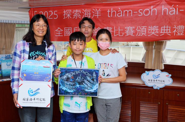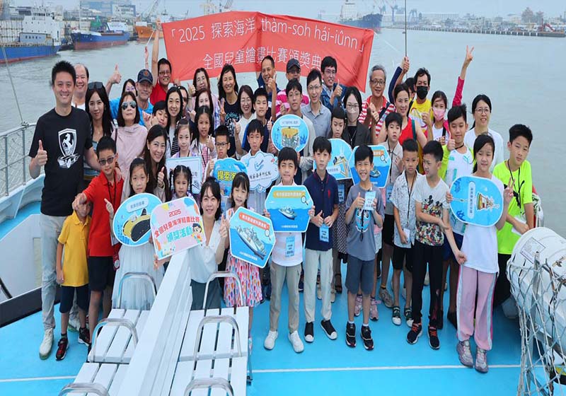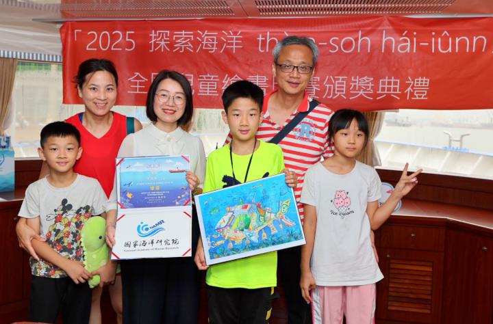 海洋委員會國家海洋研究院第六屆全國兒童海洋繪畫比賽,主題定為「探索海洋(thàm-soh hái-iûnn)」, 8月2日在臺灣高雄港務貴賓船舉行頒獎典禮,國海院院長陳璋玲表揚低、中、高年級金、銀、銅、優選5名、佳作20名等得主,陳璋玲說,賽事主題用羅馬拼音,邀請孩童探索海洋,盼能深化土地連結,鼓勵大家發揮想像力,透過畫筆關懷海洋,了解運用先進科研平台探索、觀測及管理海域,躋身海洋探索小科學家,持續推廣海洋科學,每名得主可獲贈印有獲獎作品馬克杯留念,典禮後安排專人導覽高雄港景致,歷屆獲獎作品可上國海院官網查詢。圖/國海院提供、文/高培德