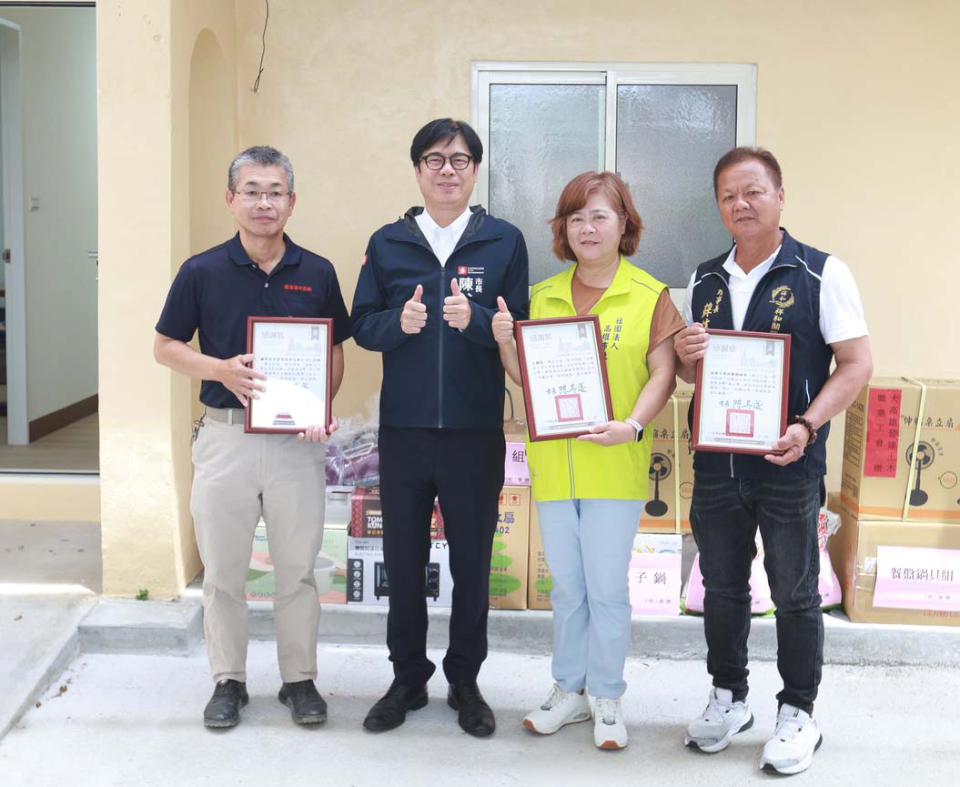 陳其邁頒狀感謝參與單位,江健興說,工會團體整合勞工專長合組高市工會行善特攻隊」,現有修繕、物資、服務等三大隊,4年協助14名弱勢及職災勞工整修住處,並辦理物資發放、義剪、義煮、義演等約230場,嘉惠15000人次。