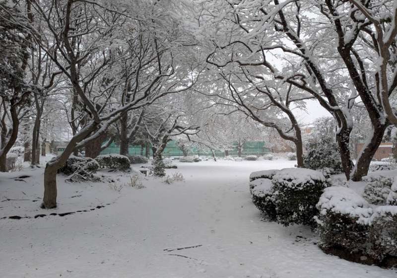 我一個人撐著傘,仔細踏穩每一步。路上幾乎沒有行人,也沒有車,四周很安靜。走在前往投票所的路上,我在十字路口停下來,看向對面的公園。原本有四季顏色的公園,變成一片白茫茫。