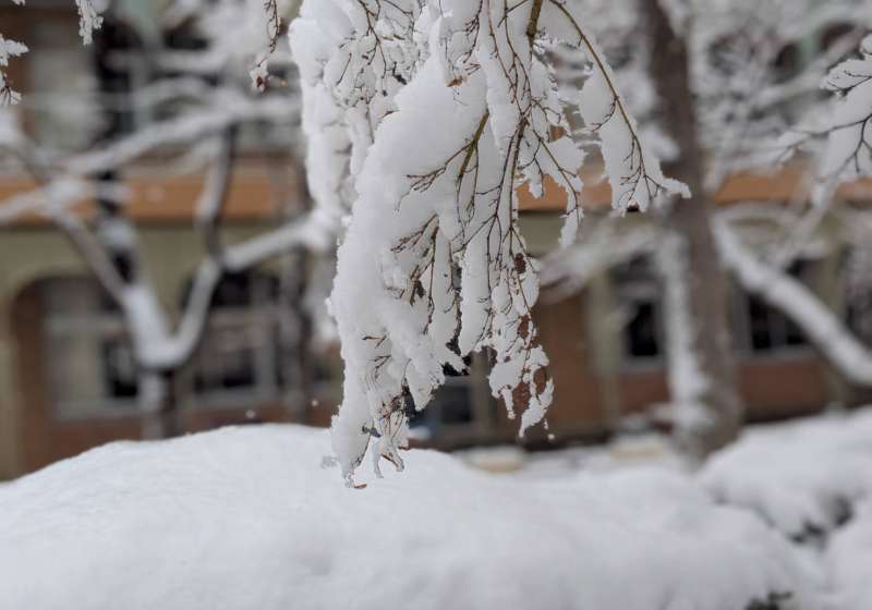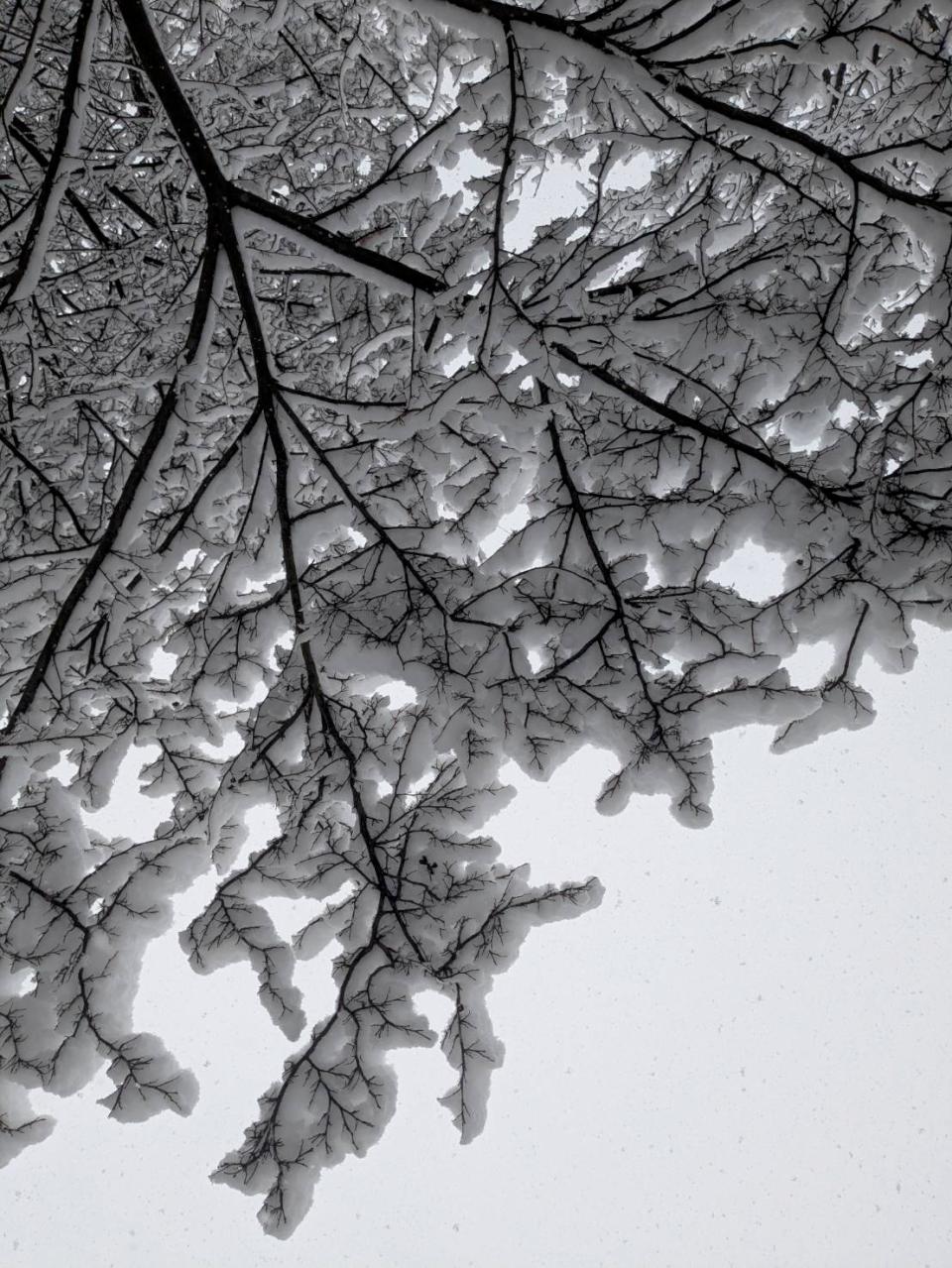 公園旁邊是兒子以前就讀的小學,櫻花樹的枝條上,雪卡得緊緊的。深色的樹枝和白色的雪形成對比,看起來特別好看。平常不太起眼的校舍,在雪的襯托下,成了畫面的一部分,有前有後。