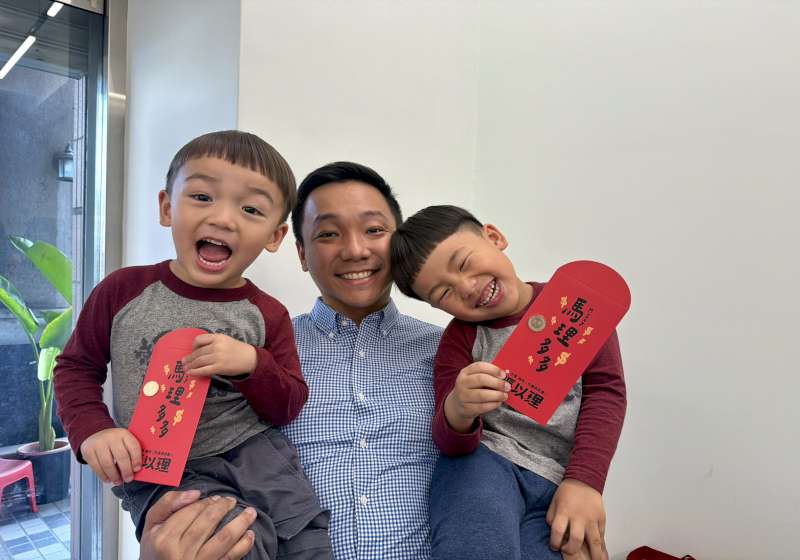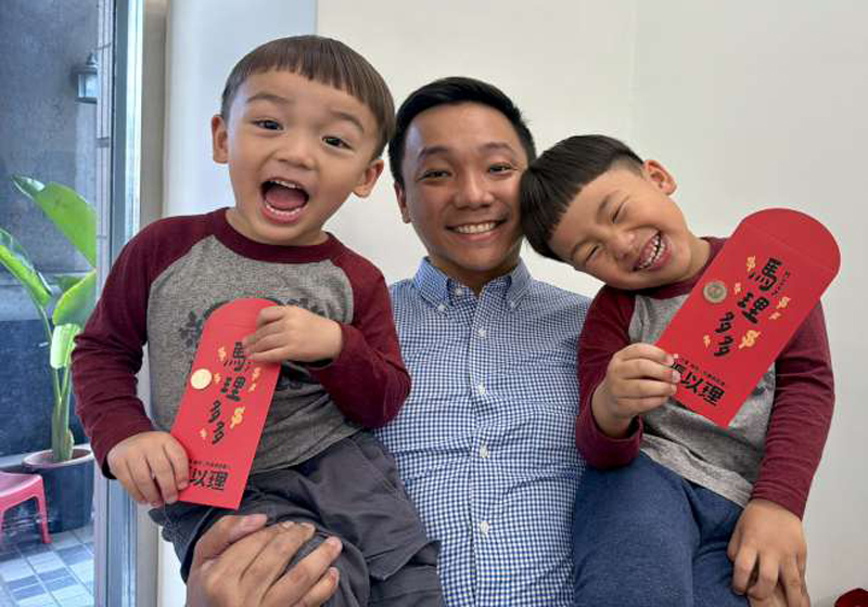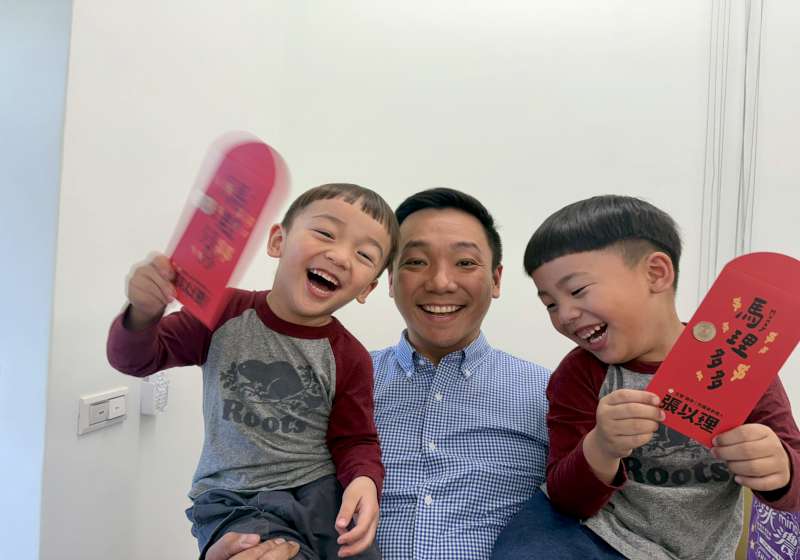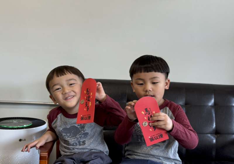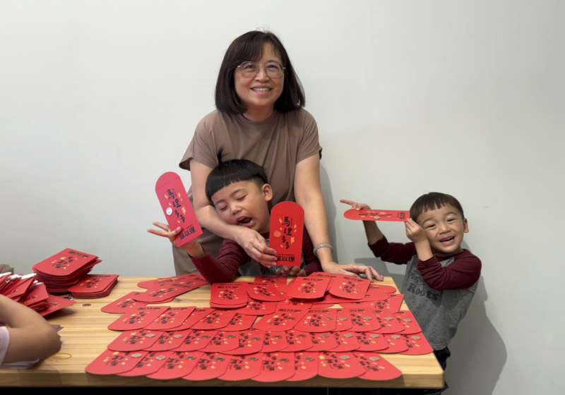 更特別的是,這些紅包袋並非委外大量製作,而是由家人親手完成。張以理的岳母與兩位兒子一同加入「手作行列」,從備料到黏貼硬幣,一個步驟一個步驟慢慢完成。全家人齊心投入,不僅讓小物更具溫度,也象徵一家人共同為地方服務、為理想努力的心意。