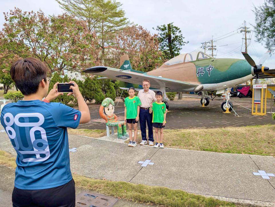 高市岡山區兆湘國小受贈空軍編號0720「中興號」螺旋槳教練機進駐10年114年噴漆整修全新亮相,續扮演推動航空科普與全民國防教育角色,吸引校友拍照打卡,