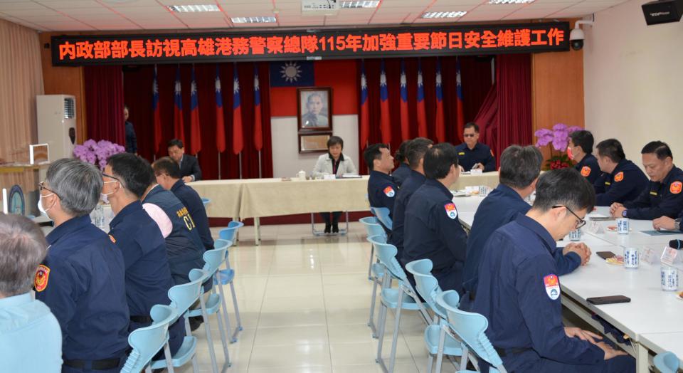 內政部長劉世芳2月9日訪視高雄港務警察總隊115年加強重要節日安全維護工作整備現況,頒贈加菜金慰勉春節執勤人員辛勞付出,也期勉大家落實治安平穩、交通順暢、民眾安心等重點工作,