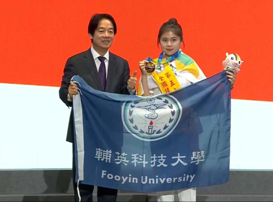 勞動部第54屆全國技能競賽5月21日舉行閉幕及頒獎典禮,高市輔英科技大學護理系四技三年級生張芊樺(圖一右)拿下健康照顧金牌,締造三連霸紀錄,接受總統賴清德表揚,另五專四年級生李聿嵐(圖二右)摘銅,校長林惠賢說,綜合類雜誌2024台灣最佳大學排行榜,學校入榜醫科大學前10強,任內推動快樂學習領先南部私立科大榮獲教育部評選就學穩定率第一,護理系師生表現值得嘉勉。