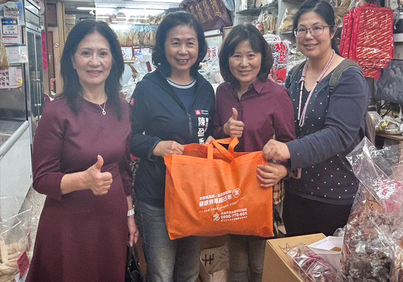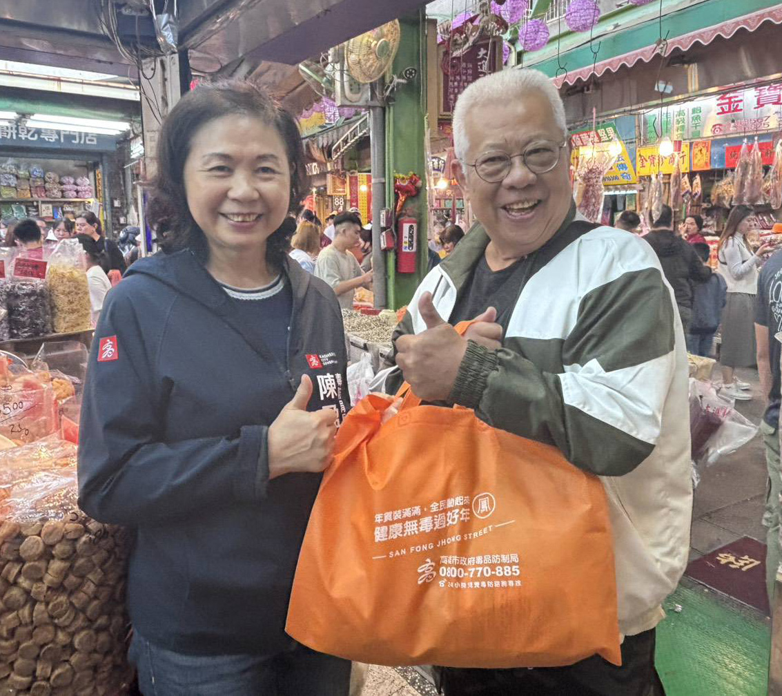 「2026三鳳過好‧馬耀迎春年貨祭」活動1月31日在高市三鳳中街起跑,高市毒品防制局局長陳盈秀分送印有「健康防毒、安心過年」環保手提袋宣導反毒,陳盈秀說,春節全家團圓相聚,結合商圈應景活動,邀請大家採購年貨同時,支持拒絕毒品誘惑,健康過好年。