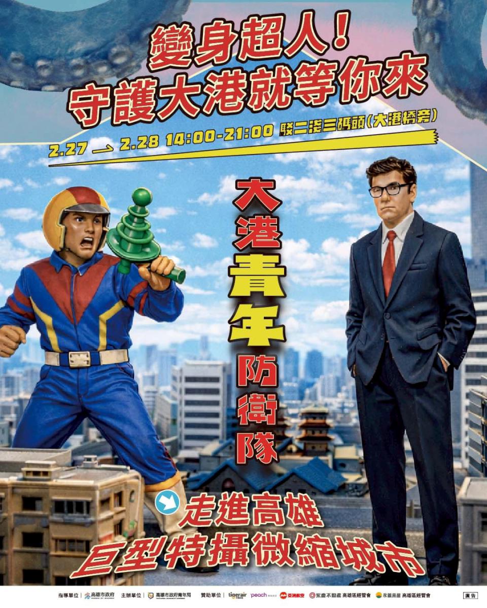響應2026高雄冬日遊樂園(Kaohsiung Wonderland),高市青年局「大港青年防衛隊」活動2月27日至28日在駁二藝術特區淺三碼頭舉行,內容涵蓋參照大螢幕場景打造「特攝微縮城市」、結合創業關卡「超級青年特訓基地」、限量12套日本來回機票大放送「OH!霸賞」等,青年局長林楷軒說,活動靈感來自70至80年代日本昭和怪獸美學風格,還原龍虎塔、衛武營、高雄流行音樂中心、85大樓等地標,型塑高130公分特攝微縮城市,民眾可化身超人守護城市安全,好拍好玩,呼應視覺策展。