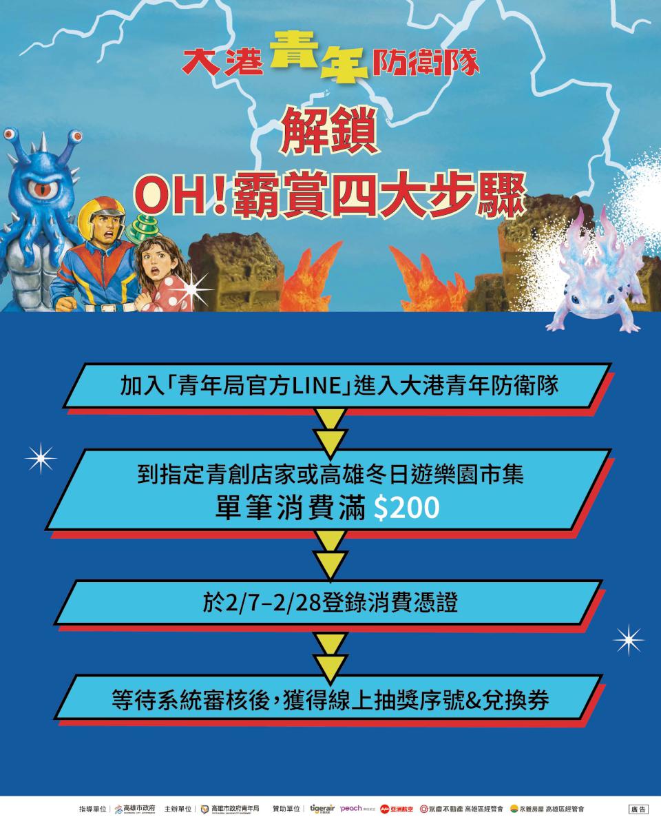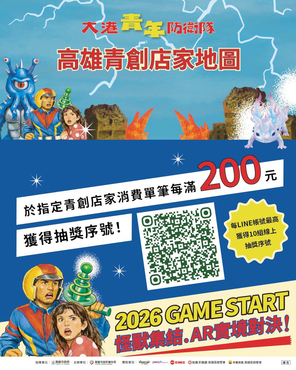 「OH!霸賞」即日起至2月28日指定青創店家單筆消費滿200元並加入青年局官方社群登錄發票,可獲專屬英雄序號,有機會抽中市值近40萬元12套高雄至日本來回機票,2月27日至28日現場即時抽超人力霸王限定周邊,結束還有線上加碼抽。擴增實境(AR)怪獸對決,智慧型手機掃描QR code擊退入侵怪獸,同步錄製對決畫面,更多活動資訊可上青年局及大港青年防衛隊官網查詢。圖/青年局提供、文/高培德