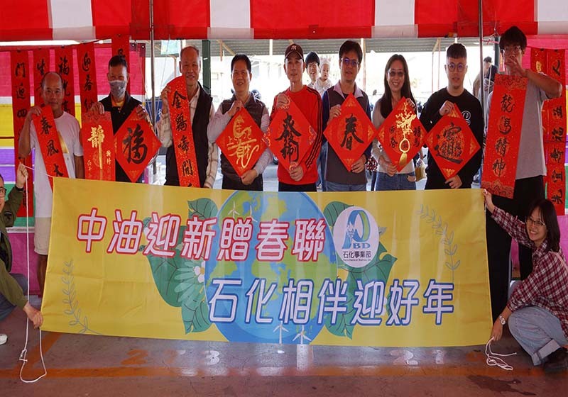 台灣中油石化事業部「迎新贈春聯」活動2月7日在林園夜市舉行,邀請楊德勝、吳桂猛、劉仲、王小林、李進宗、王苡蘋、王畯銨等7名書法名家現場揮毫贈限量1000份春聯,中油石化事業部公關組經理龔介宇說,透過活動分享節慶喜悅,祝福大家新年平安健康、事事順心。圖/中油石化事業部提供、文/高培德
