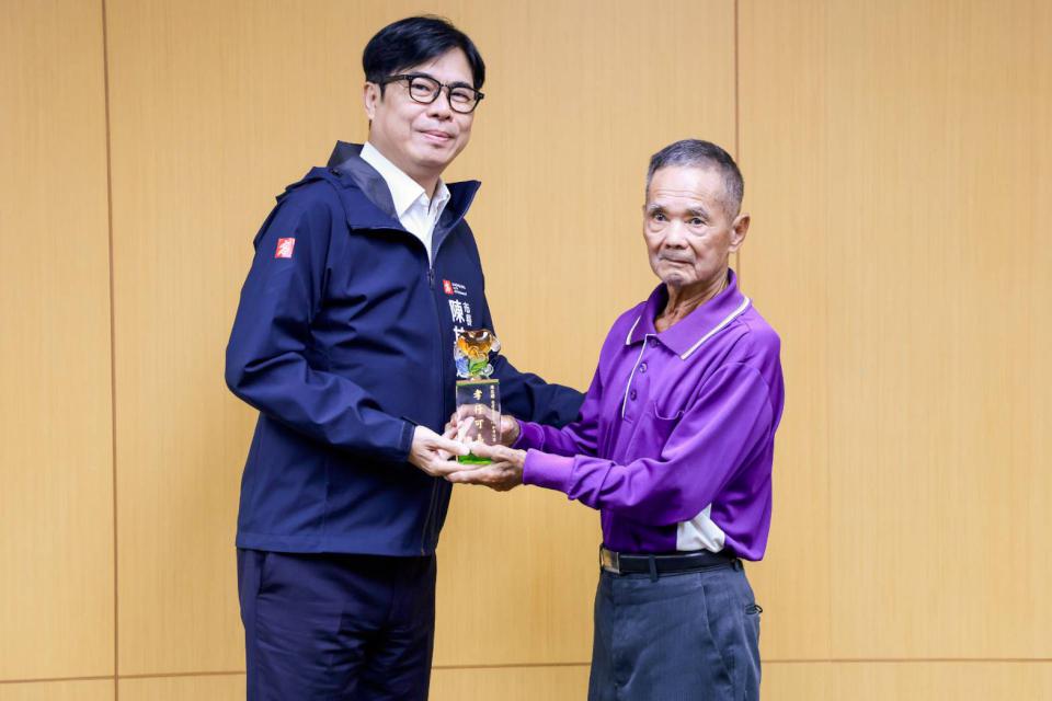 高市府10月14日舉行市政會議,市長陳其邁會前公開表揚高市114年度孝行楷模呂帝君、張玉芬、葉潘玉英、蔡淑幸、施忠輝、李彬彰、黃潘淑瓊、劉雨婕、蔡如涓、賴昆毅等10人肯定孝心美德,帶動社會祥和力量, 鳥松區逾80歲施忠輝(圖一右)與家人分工侍奉百歲單親母傳佳話,接受市長陳其邁(圖一左)頒獎表揚,鳥松區長盧雪紅(圖二左)也送上紅包祝賀。