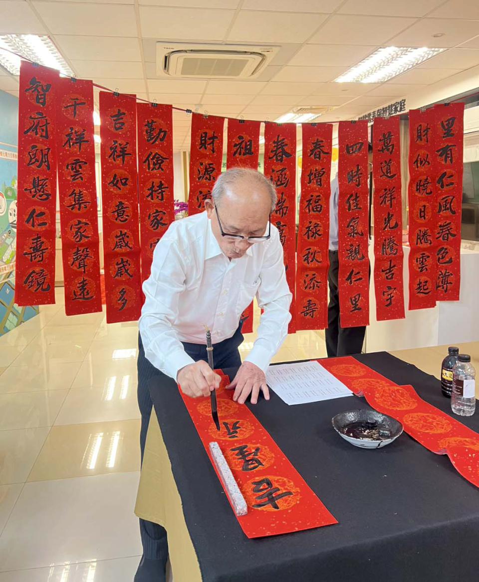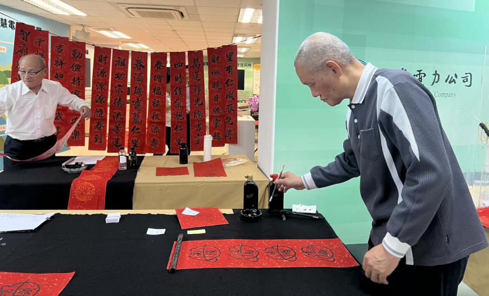 台電鳳山區處2月10日在辦理「馬年迎春、揮毫添福」活動,邀請退休同仁李新發、楊聰霖、在職員工簡志明、沈雲明等人現場揮毫「馬到成功」、「駿馬奔騰迎新歲,吉星高照報平安」等吉祥話贈限量春聯,退休13年李新發說, 離開台電前開始寫春聯,「都是因為愛!」洽公民眾表示,歲末年終追蹤贈春聯活動時間,「非台電不要」。