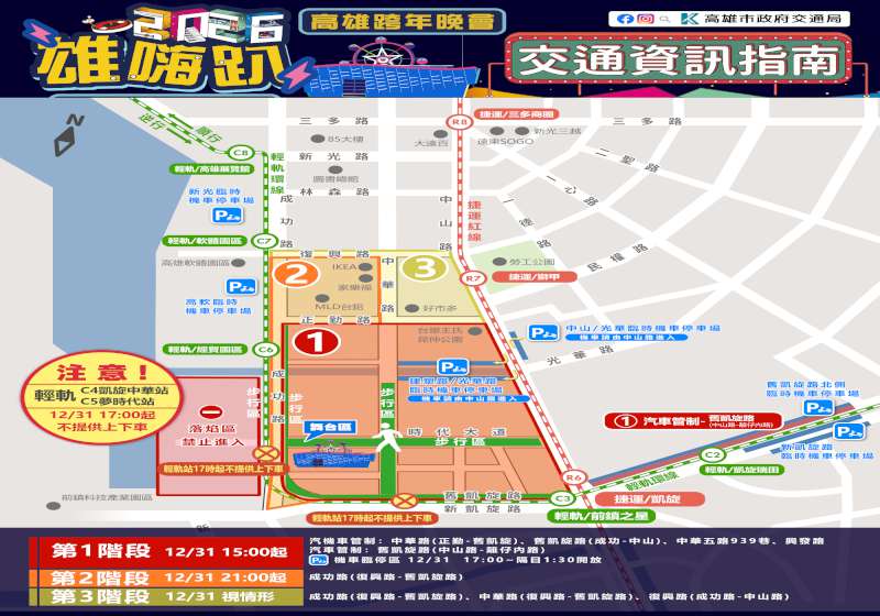高市府2026雄嗨趴跨年晚會12月31日晚上7點在時代大道舉行,夢時代周邊道路三階段交管,高雄捷運、輕軌加密班次,輕軌C4凱旋中華站及C5夢時代站下午5點起步開放上下車,高雄捷運12月31日延長營運至115年1月1日凌晨2點,輕軌12月31日延長營運至115年1月1日凌晨1點30分,台鐵加開列車至115年1月1日凌晨2點30分疏運。