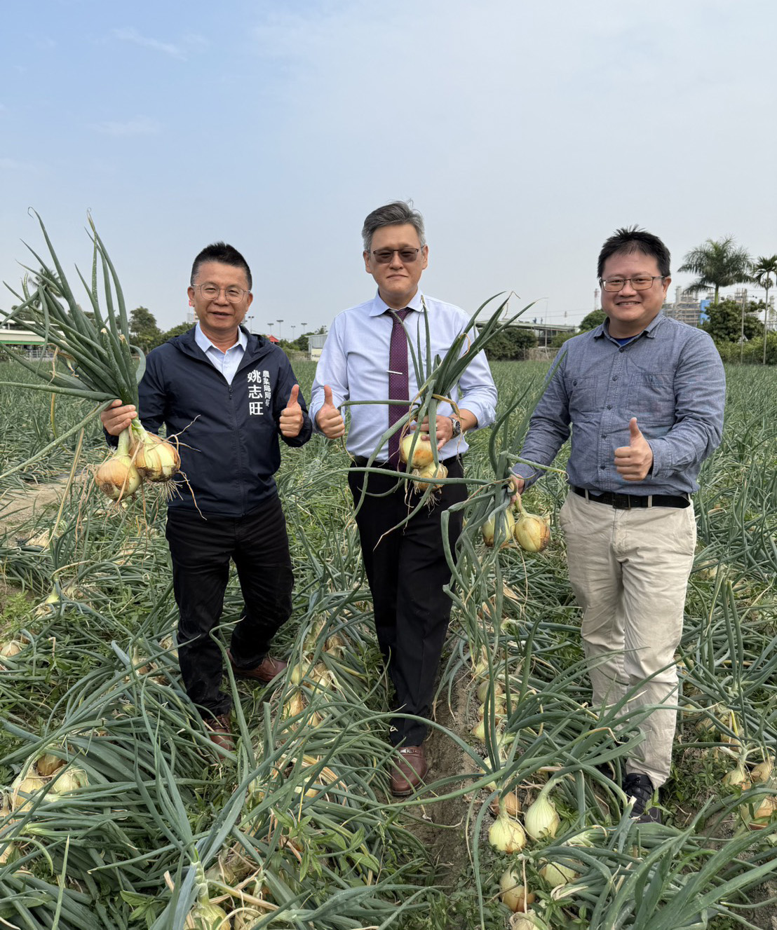 高市林園區115年洋蔥種植面積約83.57公頃,預估產量達7793公噸,農戶陸續採收,預估2月初盛產,農業局長姚志旺(圖一左)、林園區農會總幹事黃家澤(圖一中)、農糧署南區分署高雄辦公室主任陳士成(圖一右)邀請大家「蔥明下單」,品嘗在地自然鮮甜味。