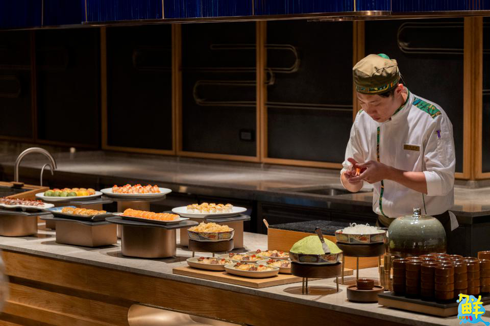 島檯「盛」-日本料理區,則是每日從台東成功漁港新鮮直送各式現流漁獲,將南方黑鮪魚、紅魽、青雞魚等鮮魚,以及挪威鮭魚腹、生食級北海道大干貝等進口高檔海鮮一字排開,而關鍵的壽司米也特別選用米香濃郁Q彈的高雄147香米。另外,此區還提供多道日式小缽及長野信州味噌湯,板前設置了4個座位,整體的細緻程度會讓人有種恍若置身高檔日本料理餐廳的錯覺。