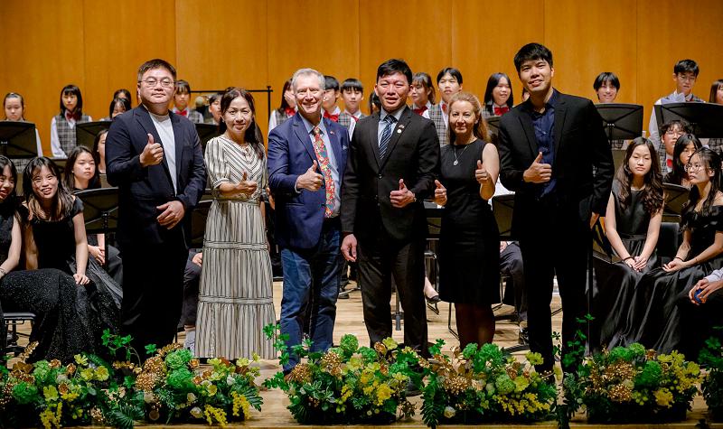 高市左營區大義國中首次攜手高雄美國學校6月13日合辦「聯合音樂會—樂動銀光(CINEMATIC PULSE)」,大義國中管樂團同台高雄美國學校弦樂團演繹膾電影配樂組曲,教育局長吳立森到場表達支持及肯定,主辦單位感謝大義國中校長郭莉芳、高雄美國學校校長James Laney, Jr.支持,還有指揮黃鈺程、Zahra Khalifeh、Cheng-Wei Hsieh專業指導。圖/教育局提供、文/高培德