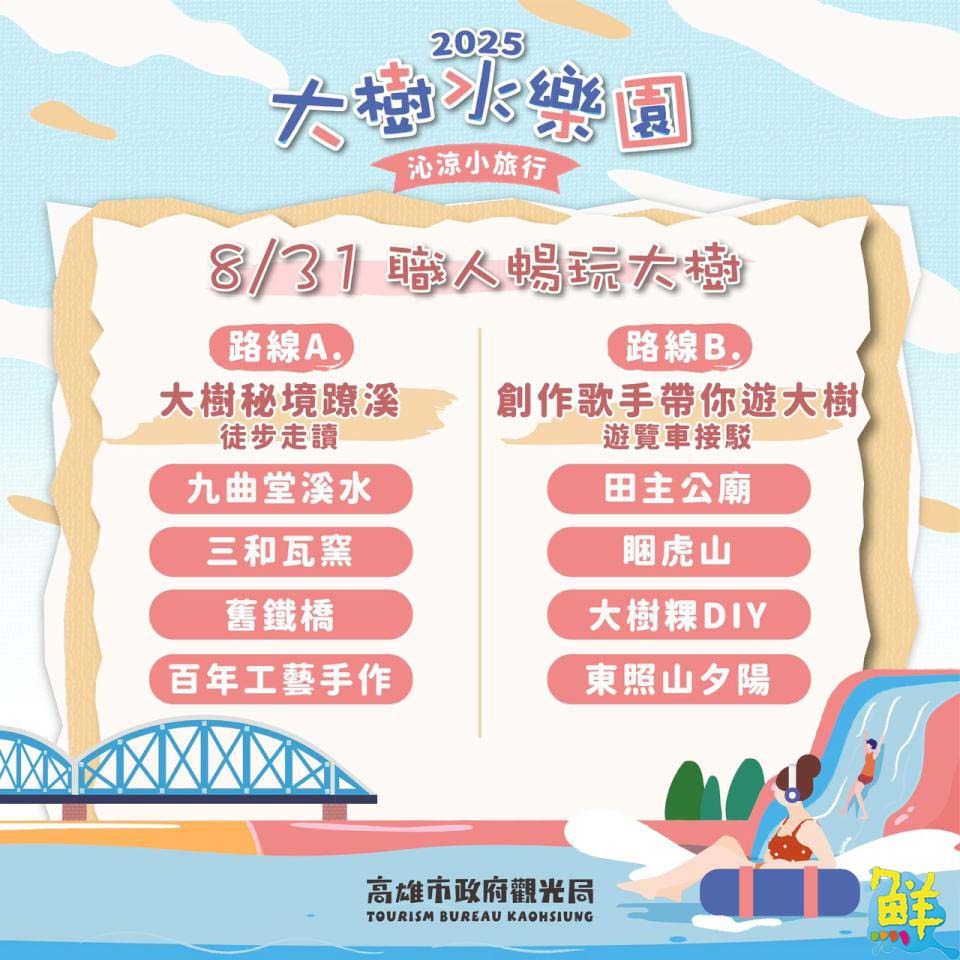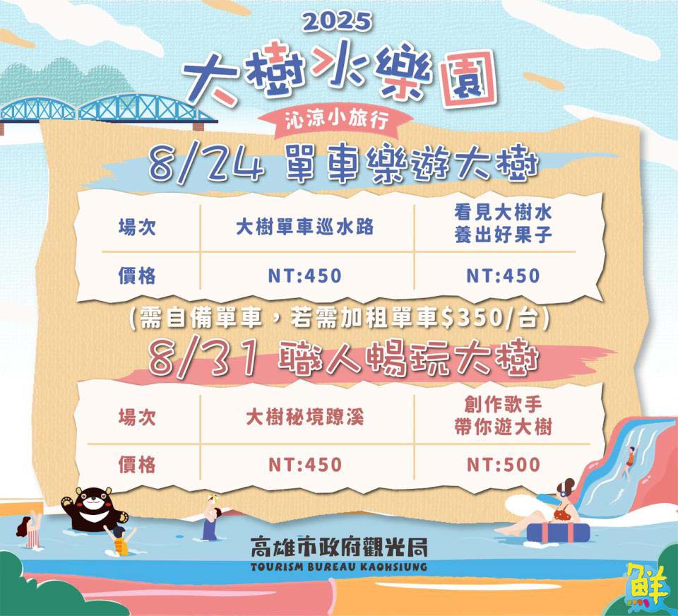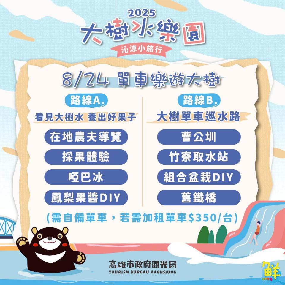 今夏何處去?當然玩瘋高雄!高市府觀光局推出夏季限定亮點活動「2025大樹水樂園」,包含最受小朋友喜愛的大型氣墊戲水樂園,還有以「單車樂遊大樹」、「職人暢玩大樹」兩大主軸規劃的四場小旅行,更包括08/24搶先登場的「大樹單車巡水路」與「看見大樹水.養出好果子」,以及08/31「大樹秘境蹽溪」與「創作歌手帶你遊大樹」共四條路線。