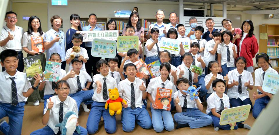 高市圖書館串連民間企業與社團資源,推動城市閱讀平權,打造共學共好社區閱讀環境,延續111及112年中鋼保全冠名贊助在河堤分館設置喜閱網專區,114年雙方再度攜手合推「品質創新‧閱讀永續」計畫,中鋼保全總經理洪瑞彬(圖一右)代表慨捐20萬元,在陽明分館成立喜閱網專區,專款添購兒童書籍,深化閱讀資源,陽明國小五年二班27名學生獻唱英語組曲炒熱氣氛。