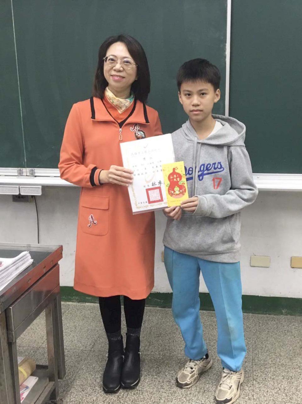 高市鳳山國中三年一班學生江詠恩(圖右)1月27日協助身障長者過馬路影片引發迴響,數吸引逾萬名網友按讚及轉發,校長林季玲1月28日公開表揚善行時說,樂見學生發揮同理心,變身行動伸援他人,足堪最珍貴禮物,教師與有榮焉。校方表示,溫情來自同理他人直覺,期能擴大善念延伸社會各角落。