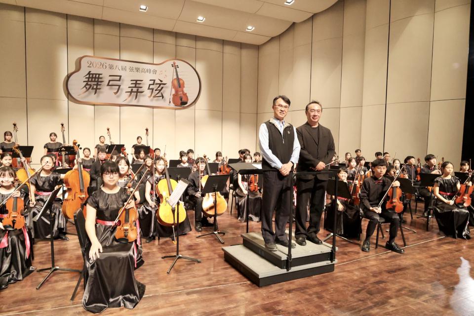 高市鼓山區明華國中弦樂團「2026 舞弓弄弦—第八屆弦樂高峰會」1 月 27 日在高市文化中心至德堂舉行,邀集台北市立明湖國中、南門國中、金華國中、大安國中、中正國中、天母國中、私立東山中學等校弦樂團輪流登台獻藝,明華國中校長鄭志昇說,