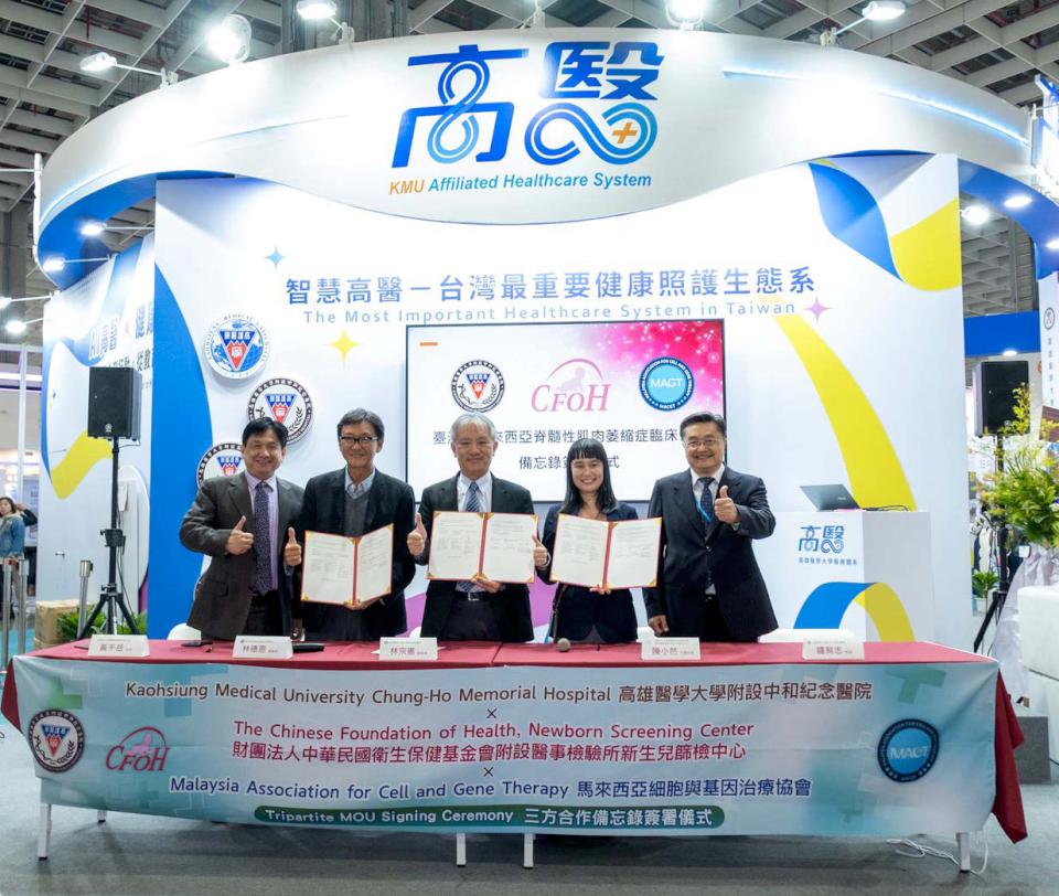 2025台灣醫療科技展12月4日至7日在台北南港展覽館舉行,高醫副院長林宗憲(圖一中)12月7日與財團法人中華民國衛生保健基金會附設醫事檢驗所新生兒篩檢中心代理所長陳小然(圖一右二)、馬來西亞細胞與基因治療協會(MACGT)理事長林德恩(圖一左二)簽署合作備忘錄(MOU),宣示結合高醫教授鐘育志領軍脊髓性肌肉萎縮症(SMA)團隊推動臨床與新生兒篩檢。