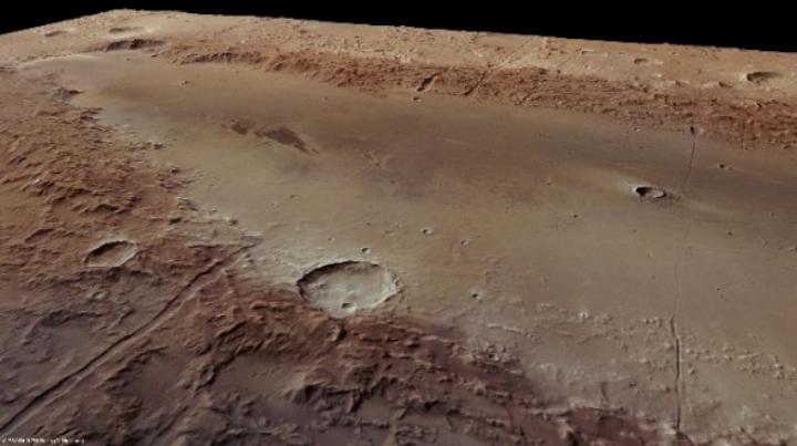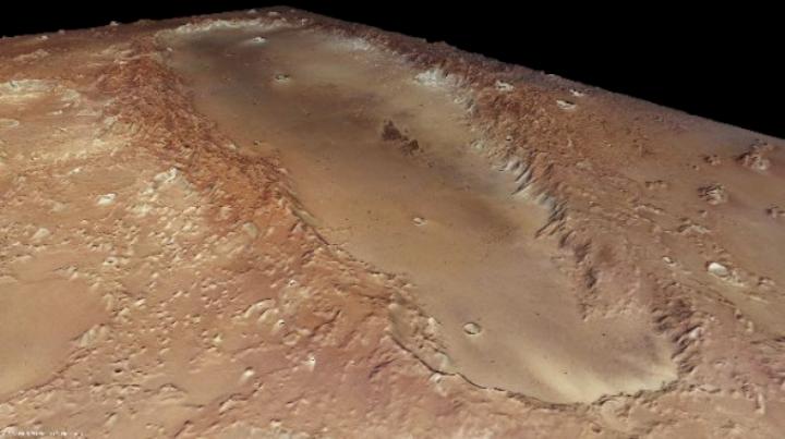 據國外媒體報道,歐洲空間局剛剛公佈一組火星照片,讓人們有機會近距離一睹一個造型奇特的拉長型環形山的風采。