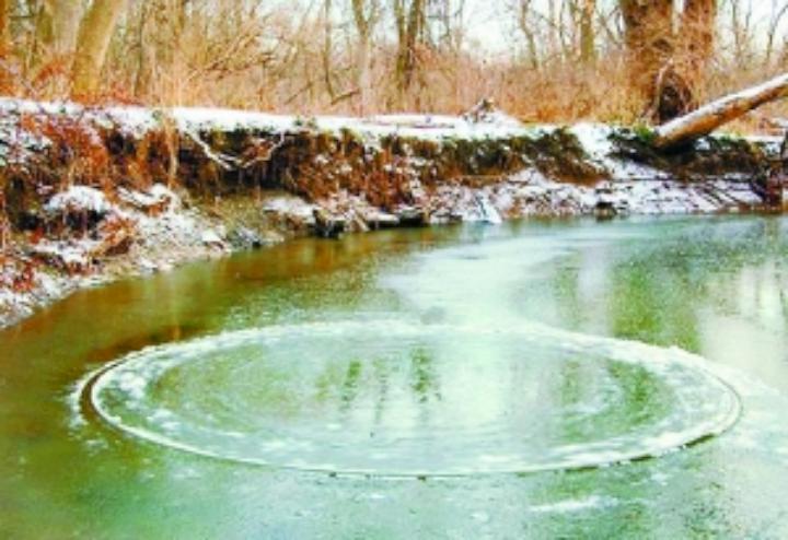 不光麥田有奇特怪圈,水面也有神秘現象:漂亮的正圓形冰圈在水中緩慢旋轉。這一奇景還流傳著幾種不同的理論。最流行的說法是河水緩慢流動會旋成一塊圓形的冰,然後隨著冰塊緩慢旋轉,邊角相互摩擦,最終形成一個正圓形。這個直徑約1.8米的旋轉冰圈是在加拿大發現的。