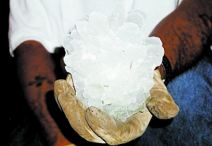 這個冰雹直徑約18釐米,周長近48釐米,降落于內布拉斯加州。這是美國發現的最大冰雹。冰雹是夏天激烈的雷暴天氣所產生的,一些水滴和冰晶併合凍結成較大的冰粒,當上升氣流無法支撐時落下。它們會對作物和財產造成嚴重損害。
