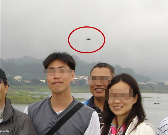 民眾在台中石岡水壩留影合照,事後在照片中意外發現天空遠處有個不明飛行物體,有網友質疑那根本只是直升機,但據拍攝者表示,當時剛下完雨,完全沒有聽到直升機聲音,現場也沒有人在玩遙控飛機。