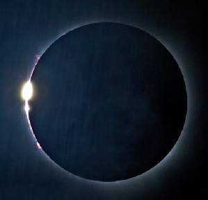 11日在智利復活島欣賞到的日全食景象,月球暫時遮住了太陽。日全食形成過程中,月球會在地球和太陽之間穿過,並在地球上投下一個圓形影子。在地面上,身在全陰影區域的觀察者可以欣賞到月球遮住太陽盤的景象,整個過程持續了幾分鐘。此時,只有太陽暗淡的上層大氣 (日冕)仍依稀可見。