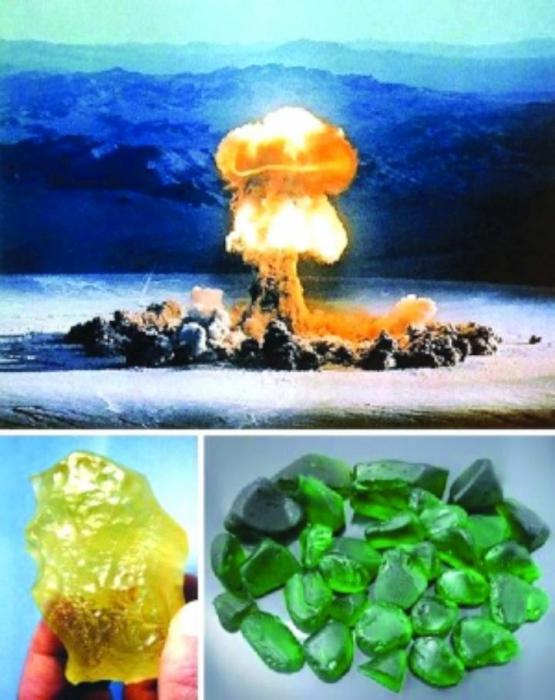 另外一種方法就是利用原子爆炸能量製造玻璃。1945年,第一枚原子彈在新墨西哥靠近阿拉莫戈多的白沙試驗基地爆炸。這顆被命名為“三一”的原子彈釋放了20000噸的能量,並將爆心周邊的大片區域覆蓋上了一層綠色的玻璃。因此這種玻璃也被命名為“三一玻璃”,它一直到現在仍具有溫和的放射性元素,也一直被收藏家和紀念品愛好者所覬覦。