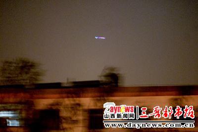 觀測期間,21時22分,正好一架飛機飛過,飛機向著太原西北飛去。不明飛行物在飛機西側,目測兩者還有很遠的距離,高度比飛機高。而形成鮮明對比的是,不明飛行物光的亮度比飛機機翼的燈光亮很多。這時,山西省展覽館的攝影師黃先生正好經過,他找好角度,拍攝了幾張照片。