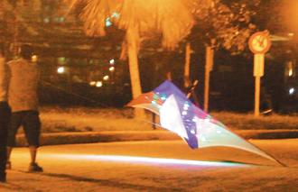 放風箏的林姓男子表示,他是水電工人,利用配水電的專長在風箏上加裝LED燈及電源,並且把燈具佈置成「法輪圈」,「這樣轉動起來才會更像飛碟」,這就是夜間放風箏的樂趣。但也常帶來困擾,包括有人報警,也有人看到後問不停,他懶得解說,因此常「躲」在暗處放風箏,欣賞「天空裡會發光的物體」。